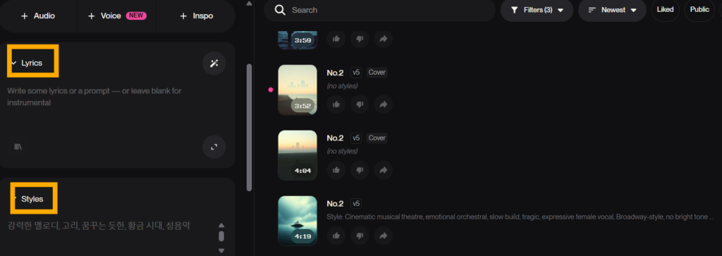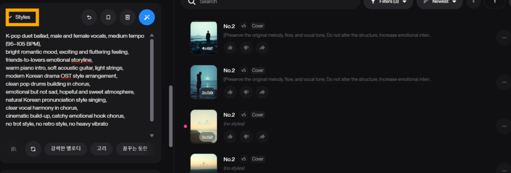 이렇게 생성된 프롬프트를 SUNO studio 스타일 입력란에 그대로 넣어주시면 됩니다.