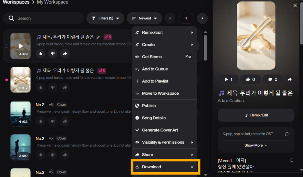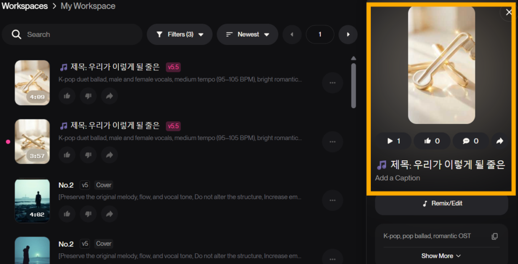 생성된 음악을 클릭해보시면 오른쪽에 제목과 함께 노래 이미지도 자동으로 생성된 것을 확인할 수 있습니다.