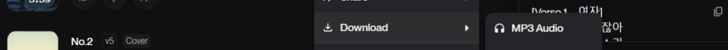 그리고 mp3 audio 다운로드를 선택해주시면 완성된 노래를 바로 저장할 수 있습니다.