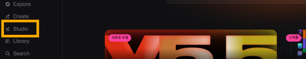 여기서 왼쪽 메뉴에 있는 studio를 선택해주시면 가사와 곡 스타일을 입력할 수 있는 화면이 나타납니다.