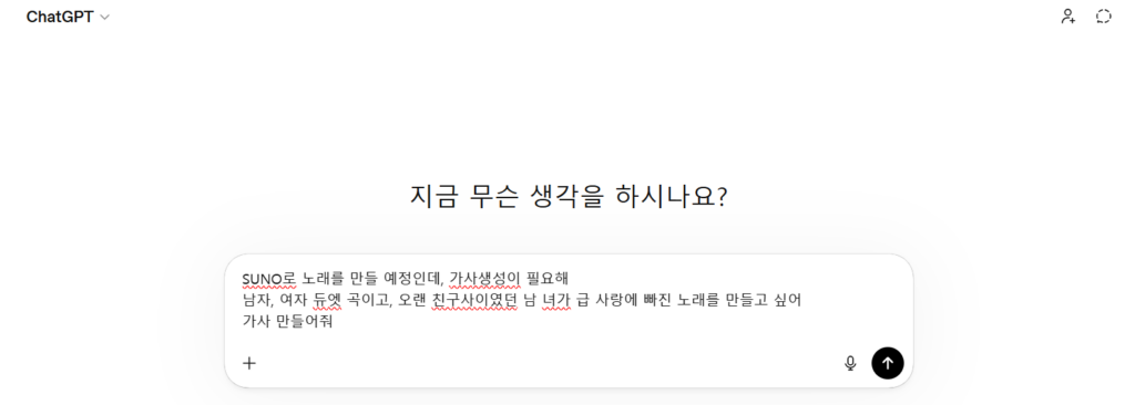 먼저 GPT에게 원하는 스타일의 노래 가사 생성을 요청합니다.