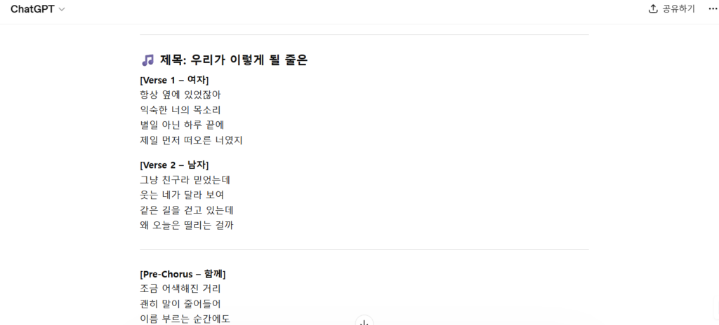 이렇게 요청하면 GPT가 자동으로 노래 가사를 생성해줍니다.