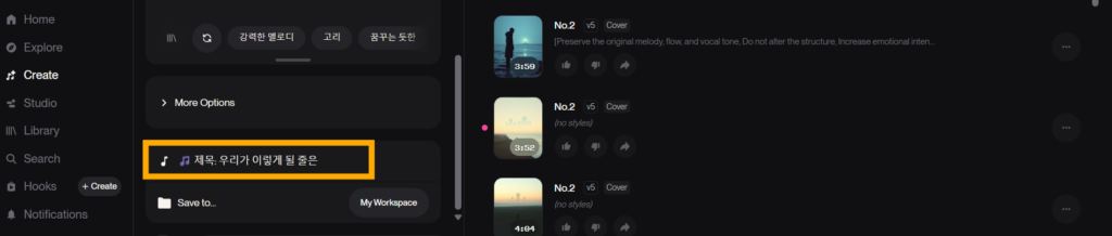 이제 GPT가 생성해준 노래 제목을 SUNO studio 하단 제목란에 입력해줍니다.