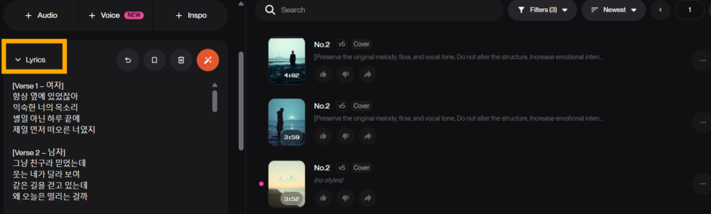 이 기능은 다른 음악 생성 AI와 비교했을 때 수노 AI만의 특징적인 기능이라고 할 수 있습니다.