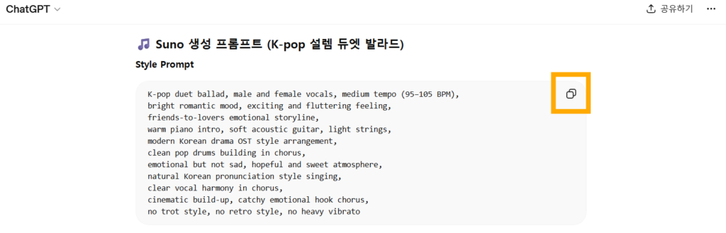 GPT에게 원하는 노래 스타일 프롬프트 생성을 요청합니다.